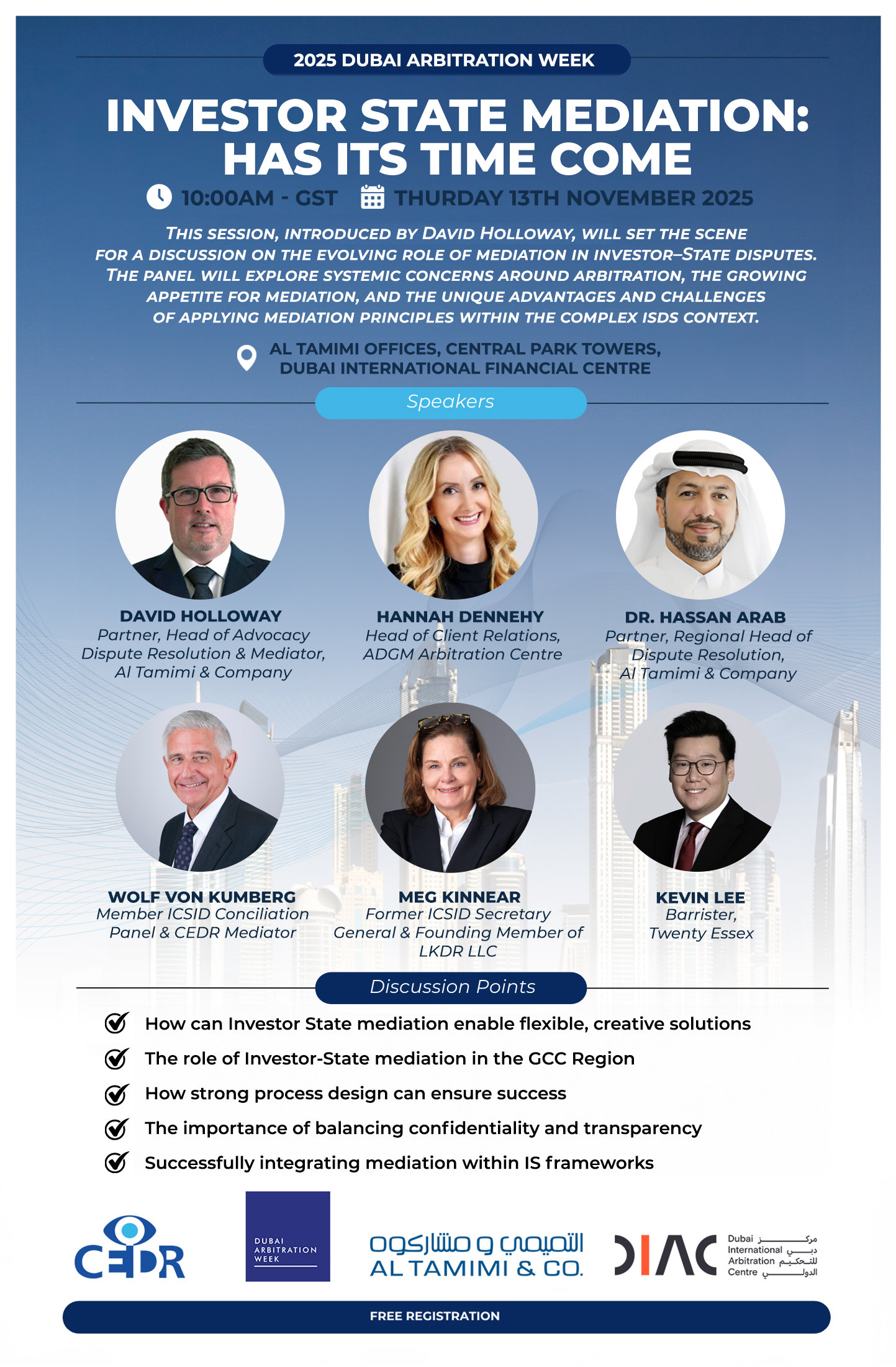 Learn what makes an effective IS mediator, from strong mediation expertise to ISDS understanding and cultural intelligence. You will hear how institutions like ADGM and ICSID are training mediators, developing credible panels, and raising awareness among States and legal counsel.